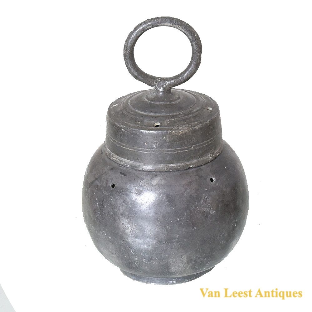 A 19th century pewter Leech jar of typical form with air holes and loop handles, signed at the bottom with ‘MA’.