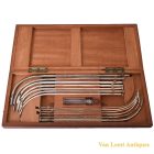 Set of 13 cased silver-plated catheters in mahogany case, made in England in the 19th Century. Containing thirteen silver-plated male catheters with proximal curve and stilets (two replacements), stamped with gauge number and broad arrow, with glass bottle for lubricant, in fitted, mahogany case.