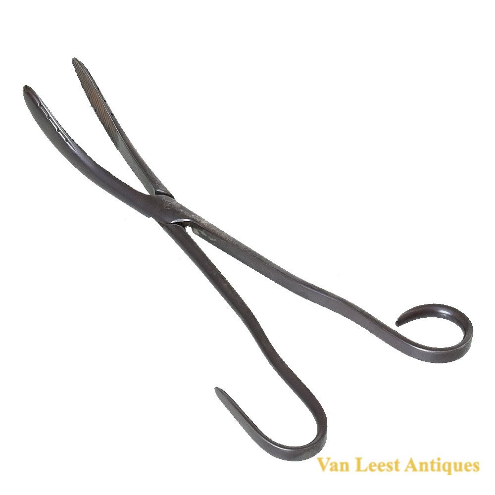 Lithotomy forceps by Young Edinburgh of the 19th Century. Made of steel with serrated jaws on the interior and with small perforations, with ring and open handle