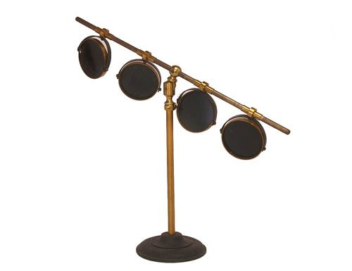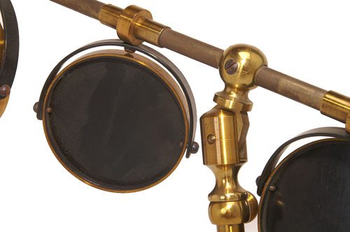 A scientific instrument with four mirrors. This apparatus was designed to rejoin the light, that was divided into spectrumcoulours by a prism. It has four adjustable mirrors, diam. 8cm, on a mobile bar. On a brass stand with iron base. Total height 37cm.