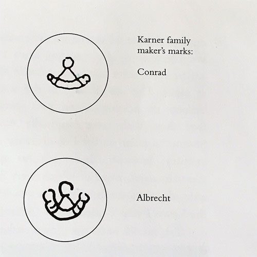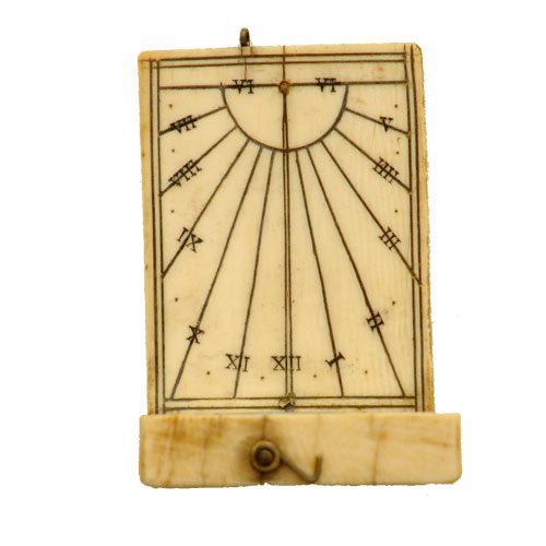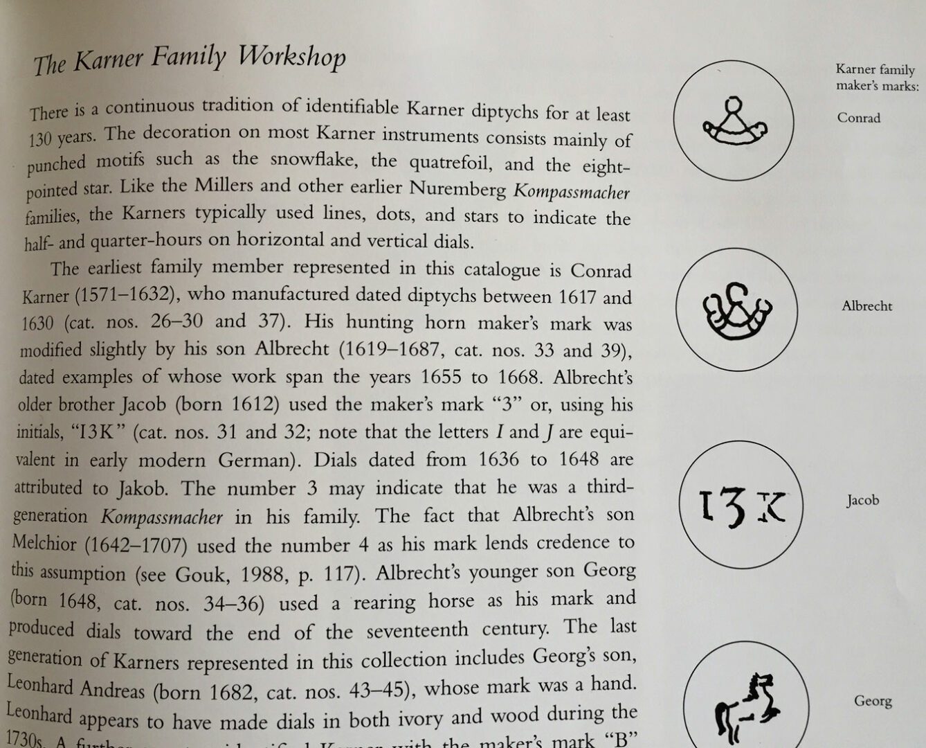 An Albrecht Karner (1619-1687) Ivory Sundial with the logo of Albrecht on the bottom of the Sundial. Having regard to the magnetic inclination and in certain way simpler look of the Sundial, the Sundial is from the early days of Albrecht. The logo is mentioned in the books “Ivory Diptych Sundials” (Harvard University) and “The Ivory Sundials or Nurnberg”. In addition there are three grouped decorative motifs on the front in the form of Red Suns. These Suns were used by multiple members of the fam. Karner. Hinges and brackets are in original condition, the shooting wire is not present. The sundial is located in a sheath of a later period. Dimensions 5 x 3.7 x 1 cm.