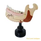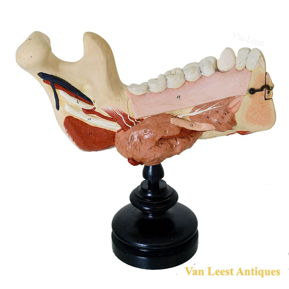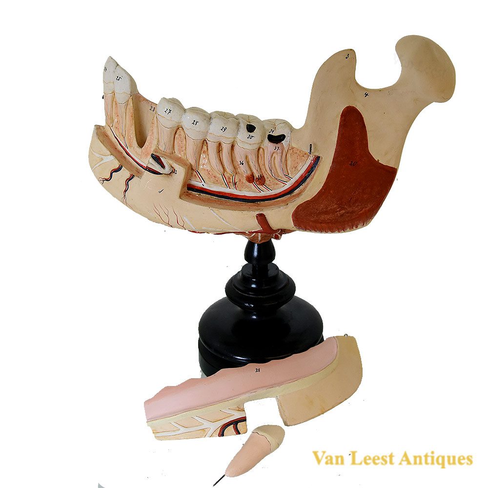 Antomcial left underjaw model, plaster and polychrome painted on a wooden turned bass. The Cuspidaal (33) and a part of the bone/gummy are removable. The model also shows the nerves, arteries, glandula sublingualis,caries and apical periodontitis at 37. The model is in excellent condition. Height (with stand) 26 cm. Width: 27 cm.