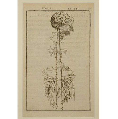 Van der spieghel studied at padua under girolamo fabrizio (1537-1619) and giulio casserio (1552-1616) and graduated arround 1604 till master in medicine. In 1612 he left italy for belgium. He remained there briefly, however, then travelled through germany and finally settled in boheme. Soon afterwards he became medicus primarius of bohemia. On december 22, 1616, the venetian senate appointed spieghel professor of anatomy and surgery. He had been nominated to this position by the venetian patrician, giustiniani, venetian ambassador to the emperor in prague when spieghel was there. This print gives an impression of the anatomy of the brains with nervous system. Tabula I lib. VII Â 127. In passe-partout, 35 x 50 cm