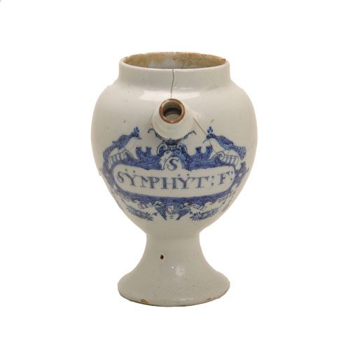 This syrup jar with a peacock motif with the inscription s symphyt;f; is dated early 18th century.