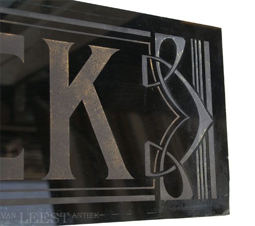 A black glass board with a etched ‘apotheek’ text and art-nouveau foliage. The letters have been guilded but are faded now. Meas. 123 x 27 x 1cm.