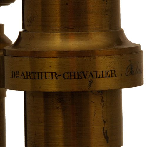 Arthur Chevalier microscope in original case circa 1865 This is a rare and important large microscope by Arthur Chevalier. It is signed on the tube “Dr Arthur Chevalier, Palais Royal 158, Paris”. The retailer was H. Olland, Utrecht who started with the business in 1853