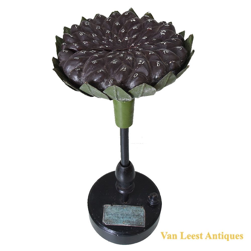 Brendel paper-mâché model of a schematic flower head system with original label, no. 170b. The flower head (capitulum) consists of short-stalked flowers on a saucer-shaped, flat flower base (receptaculum). The lateral flowers arranged in 13/34 position. The model can be separated into two halves. Another specimen can be found in the Utrecht University Museum (Object no. 0285-123093).