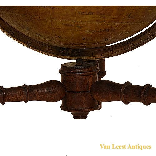 A 12 inch ( 30,5 cm) Cruchley terrestrial table globe in good original condition standing in a turned mahogany stand with engraved brass meridian ring. The Cartouch Gives: Cruchley’s Late Cary’s new Terrestrial globe – From the most recent Authorities – Exhibiting the latest discoveries towards the North Pole – and the new setllements & divisions of Australia New Zealand – California Texas & C – London – G.F. Crurchley , map seller , globe maker & Publisher – 81 Fleet street.