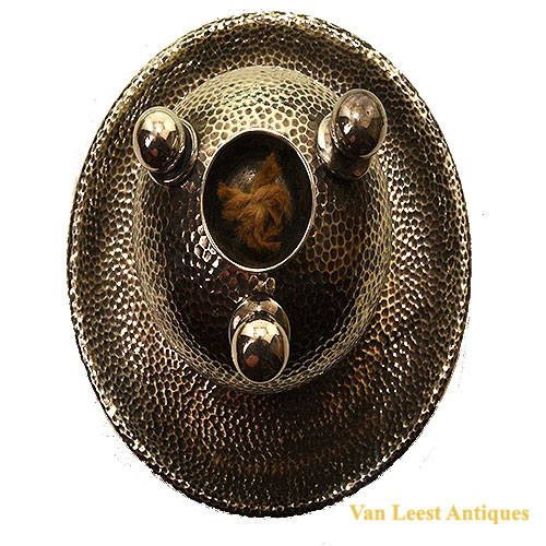 A metal cupping heater with three sticks, C 1900. Is signed by Cailar Bayak with a hallmark. The heater was used by cupping. It is a method in creating a vacuum by plugging the cotton swab soaked in alcohol and applying it to the skin. 12 cm high