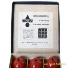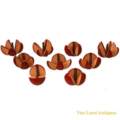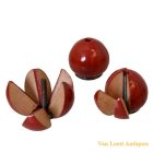 A set of nine wooden apples in original box, retailed by CRITAS, Doorn in the Netherlands, comprising nine hinged wood apple models in original cardboard box with label in lid. The wooden apples was used at education by fractions. Circa 1930 and Size box 21 x 20 x 6 cm.
