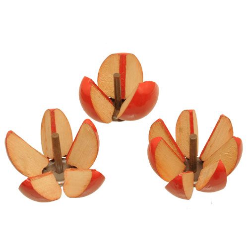 A set of nine hinged wood apple models with metal axes to illustrate the fraction to 1/10. In good condition and 5,5 cm high.