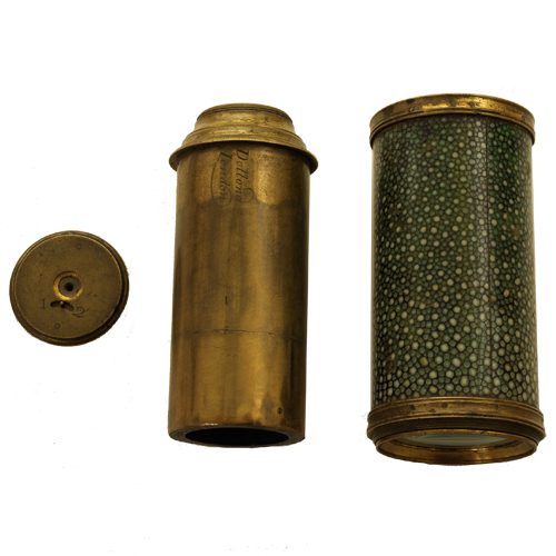 The wooden barrel of this Galilean telescope is covered in dyed rayskin (shagreen), while the single draw tube is made of brass. A thumbwheel on the eyepiece allows the viewer to select one of two lenses of different magnifying powers. The lenses by the eye piece are numbered with 1 and 2. Length 11 cm with diameter of 4,7 cm. Extension 17 cm.