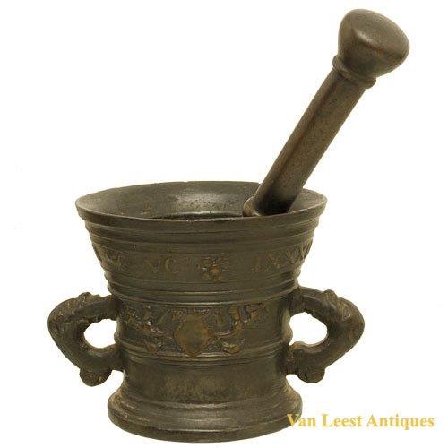 An antique bronze mortar with ears and relief decoration with original pestle. The performance of coat of arms flanked by angels, with edge lettering ‘ Anno Domini ‘ MVCLXXXIII (1683). 10 cm high.