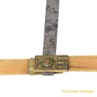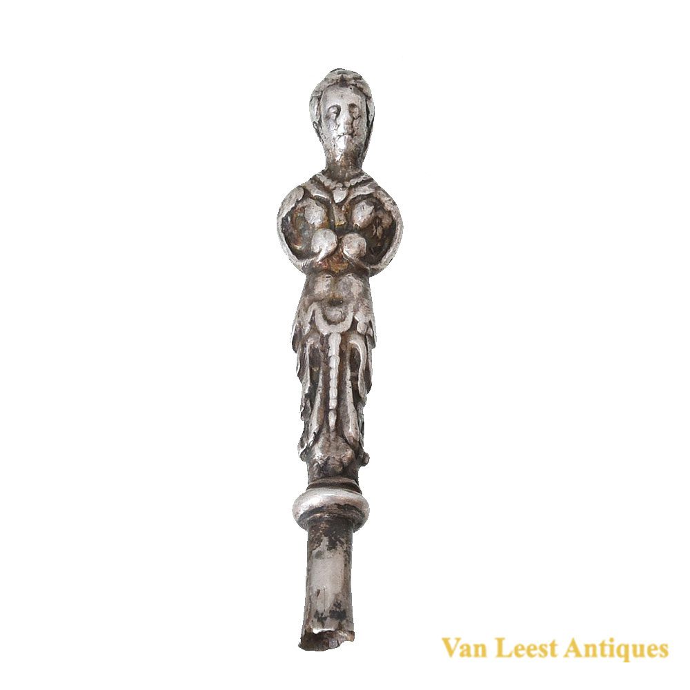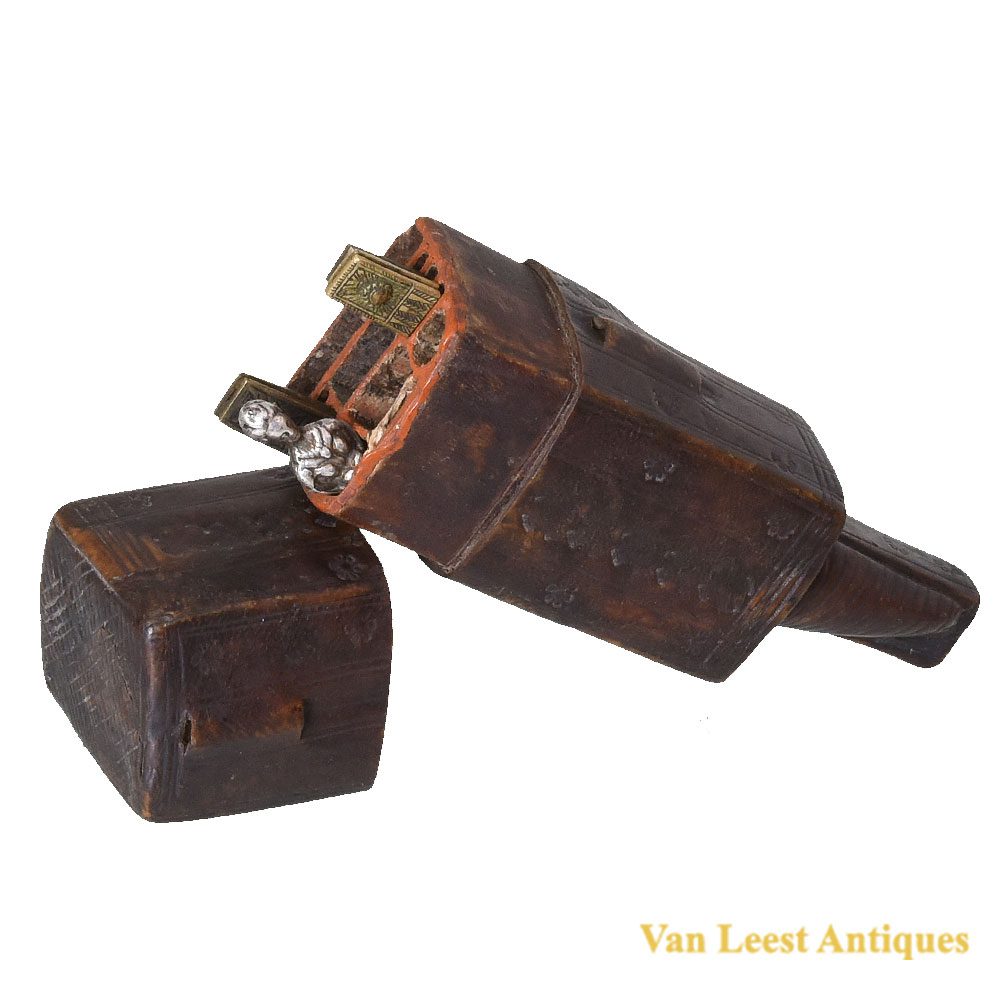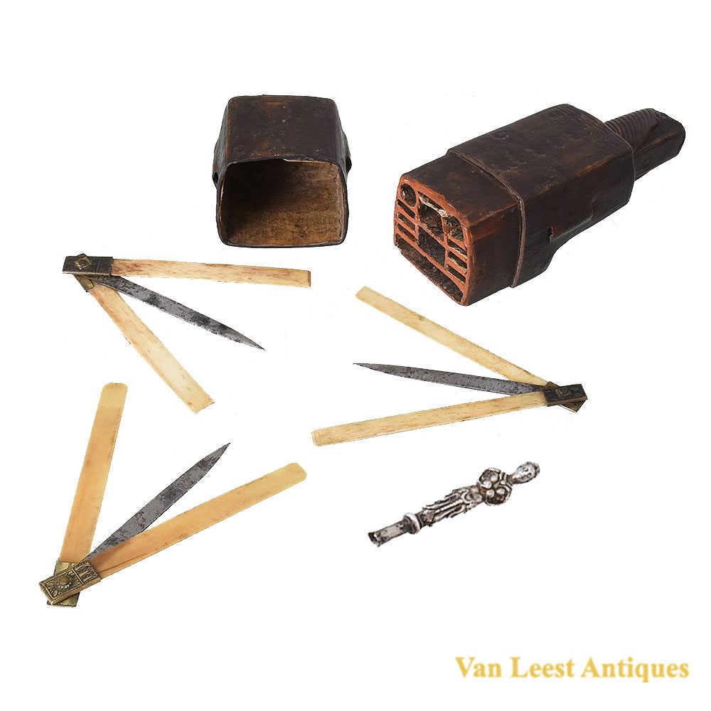 Leather surgical instrument case, possibly 15th to 17th century. In the case three 18th century thumb lancets and a silver knife handle of a surgical instrument in the shape of a woman. The thumb lancets are signed with an S, O and an I.