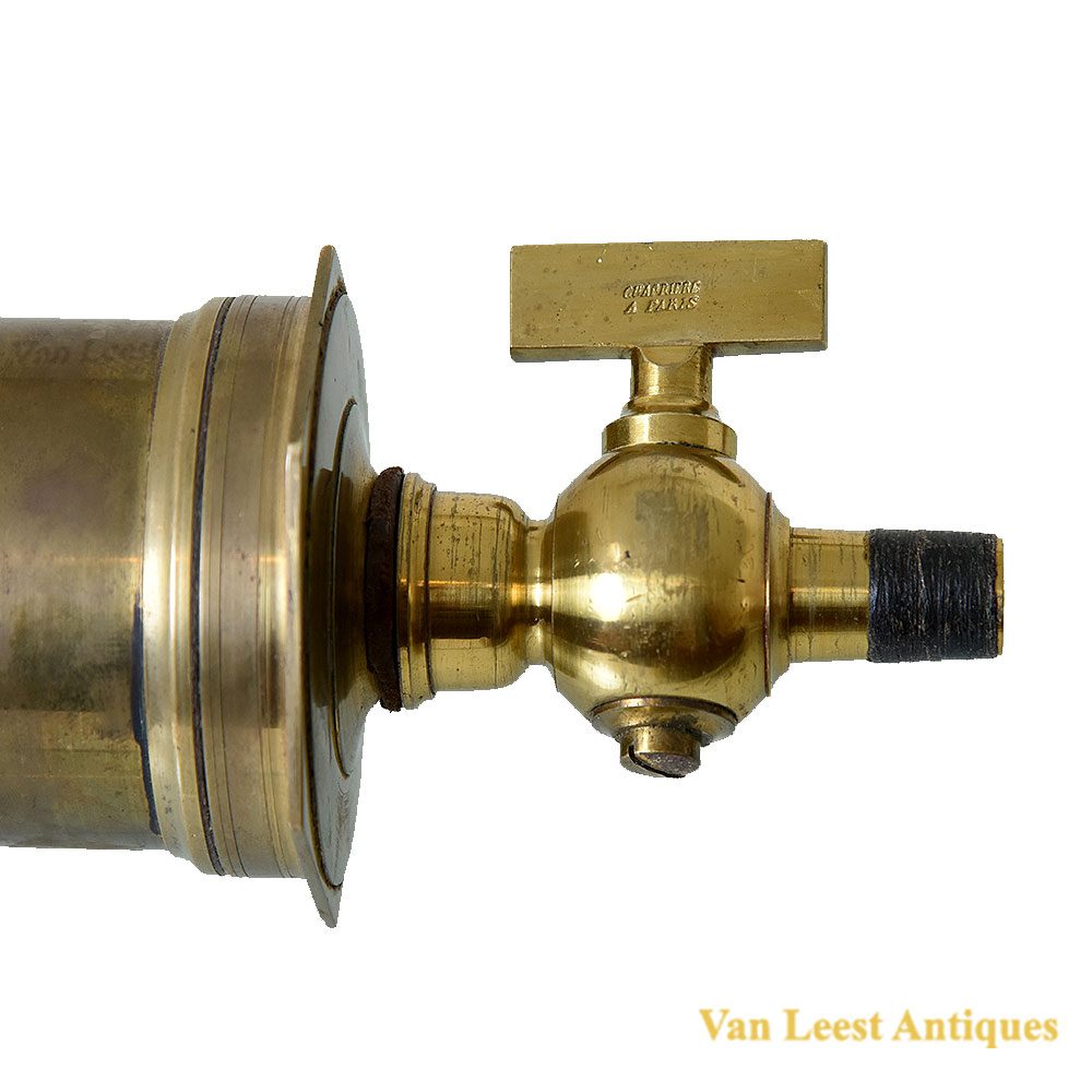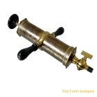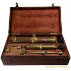 The box is composed of two large syringes, one with double reinforcement ebony handles and a smaller syringe with ebony handle, two taps and eight cannulas. Large syringes with double handles are rare, boxes with two syringes even more so.