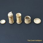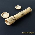 The first section of the body has a convex lens with a mounted fleaglass, which also acts as a diaphragm fleaglass. The small, high-power lens in the bone ring has a specimen pin at the correct focal distance. This section also has a magnifier function the second section has a concave lens and the last section has a convec lens. The bone and the lenses are in good condition, with only two very fine hairline crack. Length 13 cm