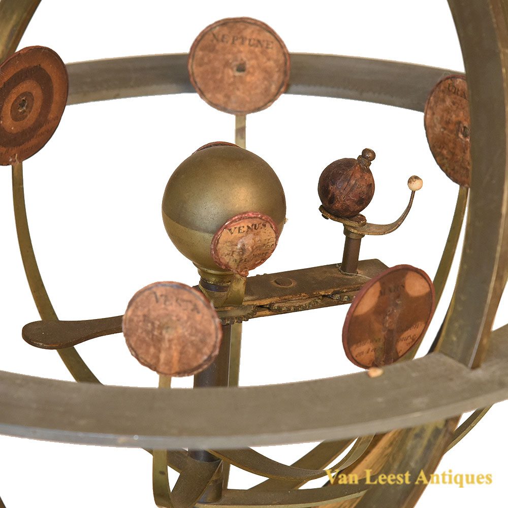 At the centre the sun as a metal ball, the earth as a miniature papier mâche globe and the moon as a white bone globe. The earth can be rotated by hand and the remaining planets are displayed as cardboard circles with copper engravings of the planets. Their names names and their complete orbit around the Sun written in years, days and hours. For Saturn it would be 20 years, 176 days and 14 hours ‘fait sa revolution en 20 ans 176 jours et 14 heures’. In good condition.