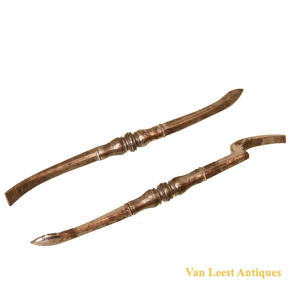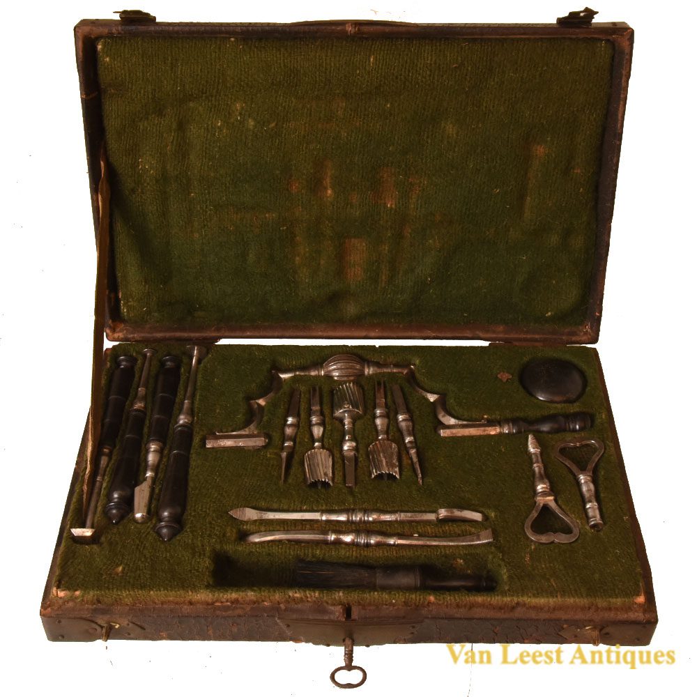 Complete Trepanning drill set by Lesueur of the last quarter of the 18th century. The case is made of wood covered with leather with a brass handle on top and hinged lids to open the box. It comes with the original key. The inner side is fitted with green velvet. The set consist of a Trepanning drill which is signed with two trademarks of Lesueur: an A with a crown. The drill has a turned ebony handle. Three interchangeable conical crown cutting drills of different diameters and two perforators, foliate drill, a key for removing the centric pin, two elevators, four lenticulars and a brush with turned ebony handle.