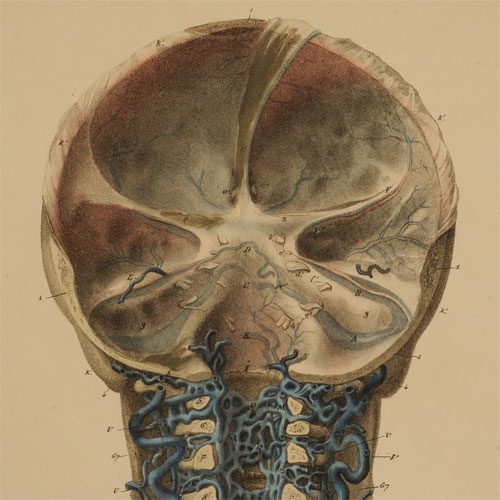 A Gilbert Breschet Print from “Recherches anatomiques, physiologiques et pathologiques sur le systeme nerveux, Plate 3 & 4â€. He was the first Anatomist  who detailed the Vertebral Venous Plexus (VVP) illustrated. There are two Anatomical prints in one passe partout with a dimension of  58 x 76 cm.