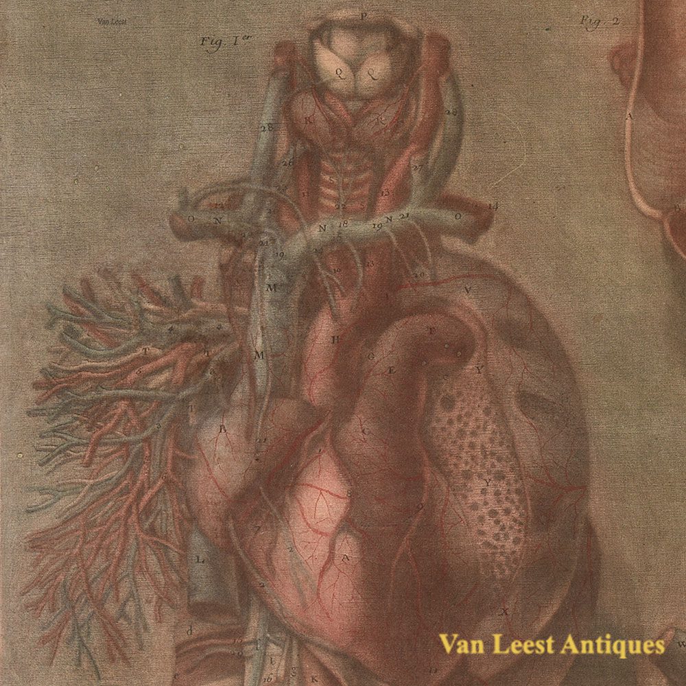 Anatomical print of the heart and lung by Jacques Fabian Gautier d’Agoty made in 1752. Plate 13 was part of the Anatomie generale des viscères en situation, de grandeur et couleur naturelle, avec l’angeologie, et la nevrologie de chaque partie du corps humain (Full edition). The translated introduction states that “In this Plate and the following one, the Heart is represented, from which the right lung has been removed, leaving only the large branches and pulmonary vessels of the latter organ. The anterior part of the left lung has been destroyed up to its notch in order to observe the internal structure; this also gives us an opportunity to see the exposed Heart.”
