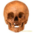 A graveyard child’s skull of approximately 8 years old. The baby teeth and adult teeth are visible in the jaw.