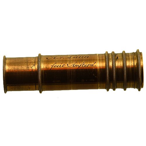 Very Rare Dutch brass pocket optical instrument in his cylindric original red leather box. late 18th century signed by “H.v.Laun fecit Amsterd.” (Hartog van Laun)Here a really interesting discovery of this unusual optical instrument signed: