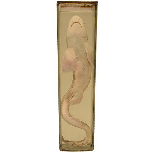 A fluid preservation of a shark. It is coming from the “Veterinary School Anderlecht – Pathologic/anatomical Collection”and will be dated in the 1950s. Measurements 43 x 11 x 8 cm.