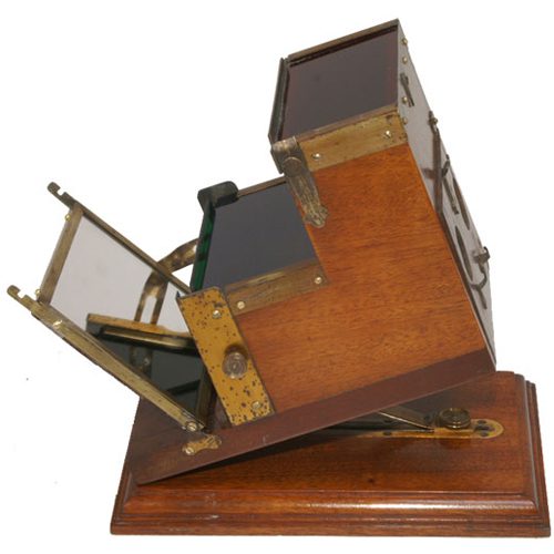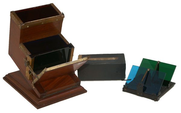 Viewer for stereoscopic colour-separation transparencies. The separations are laid on the stepped part of the viewer over glass filters coloured red, blue and green. Strongly lit from above by the hinged mirror reflector at the rear, the three images are superimposed and redirected to the viewing lenses by internal reflectors. After manual adjustment to achieve correct register, the photograph can be viewed in true colours in three dimensions.