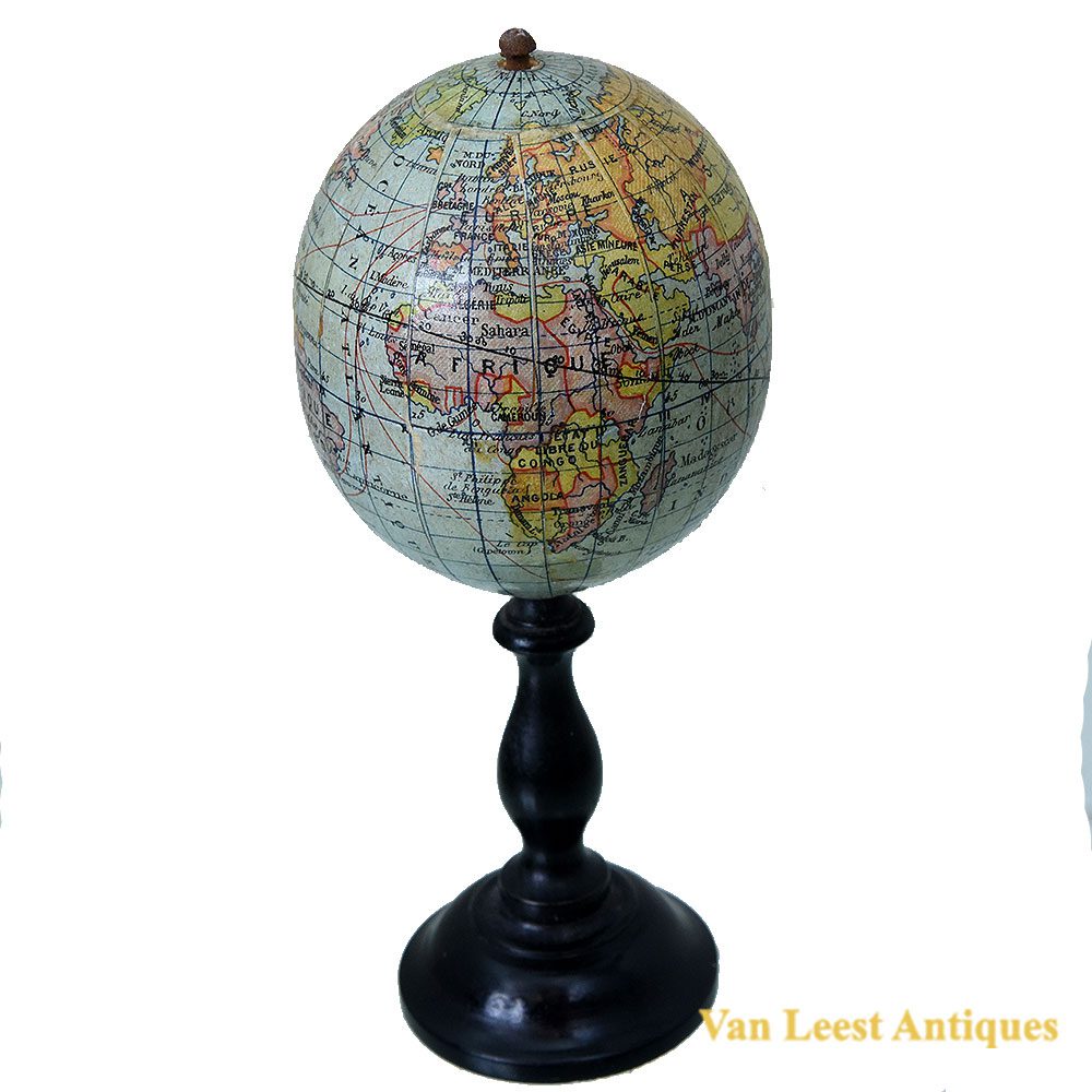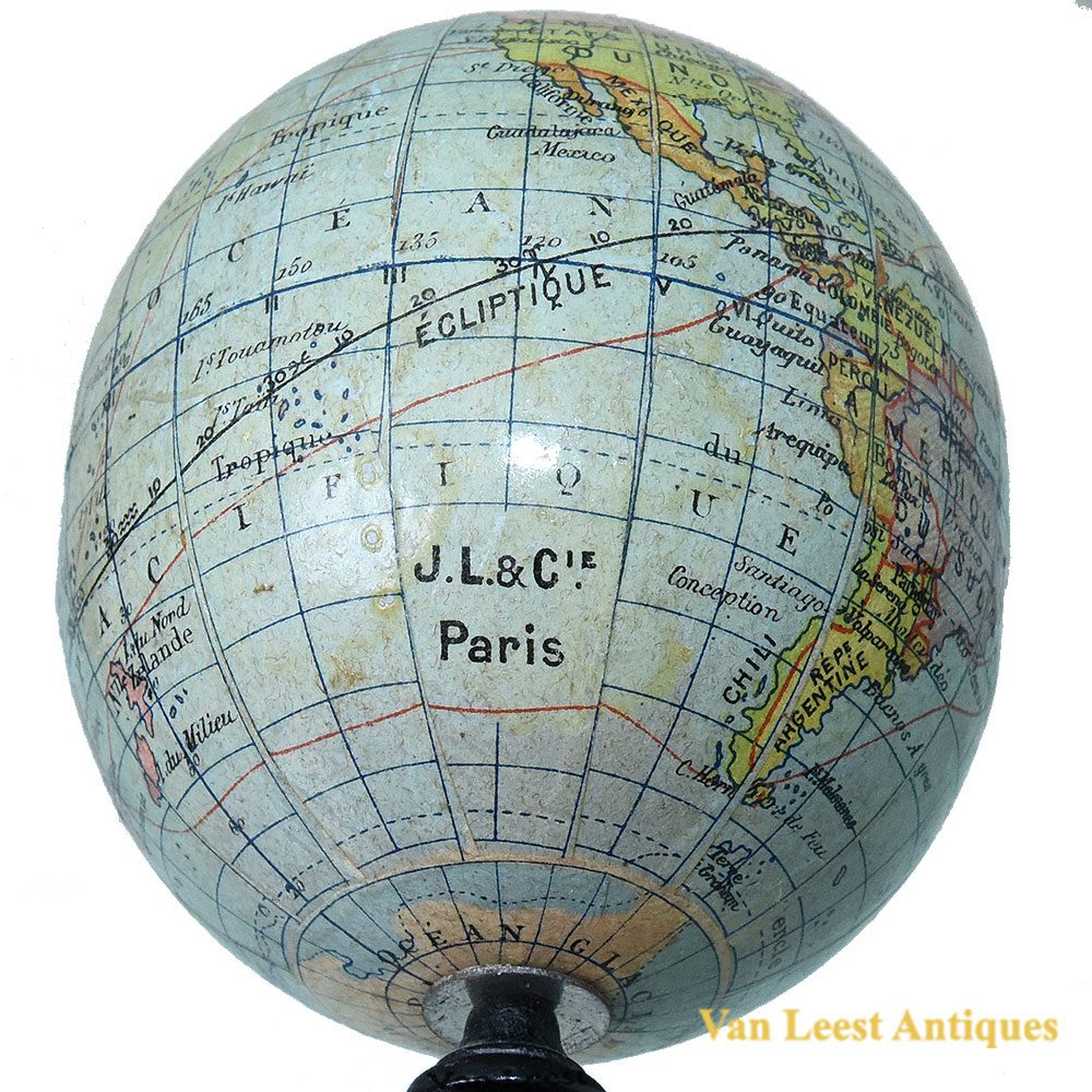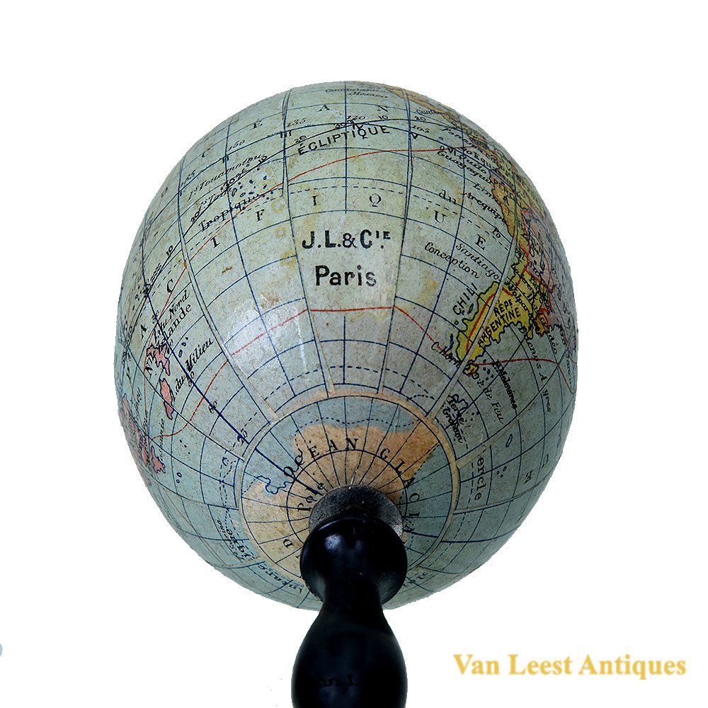 A small terrestrial pocket globe by J. Lebègue & Cie on a ebonished standaad.. The Diameter of the globe is approximately 6 cm and is signed by: J.L. & Cie (Lebegue) Paris. Circa 1905. The company Lebegue & Cie was founded in 1814 by Alphonse Lebegue in Brussels, as a maker of globes. Since circa 1850 as j. Lebegue & Cie based in Paris. The small diameter of this globe is rare for a Lebegue.