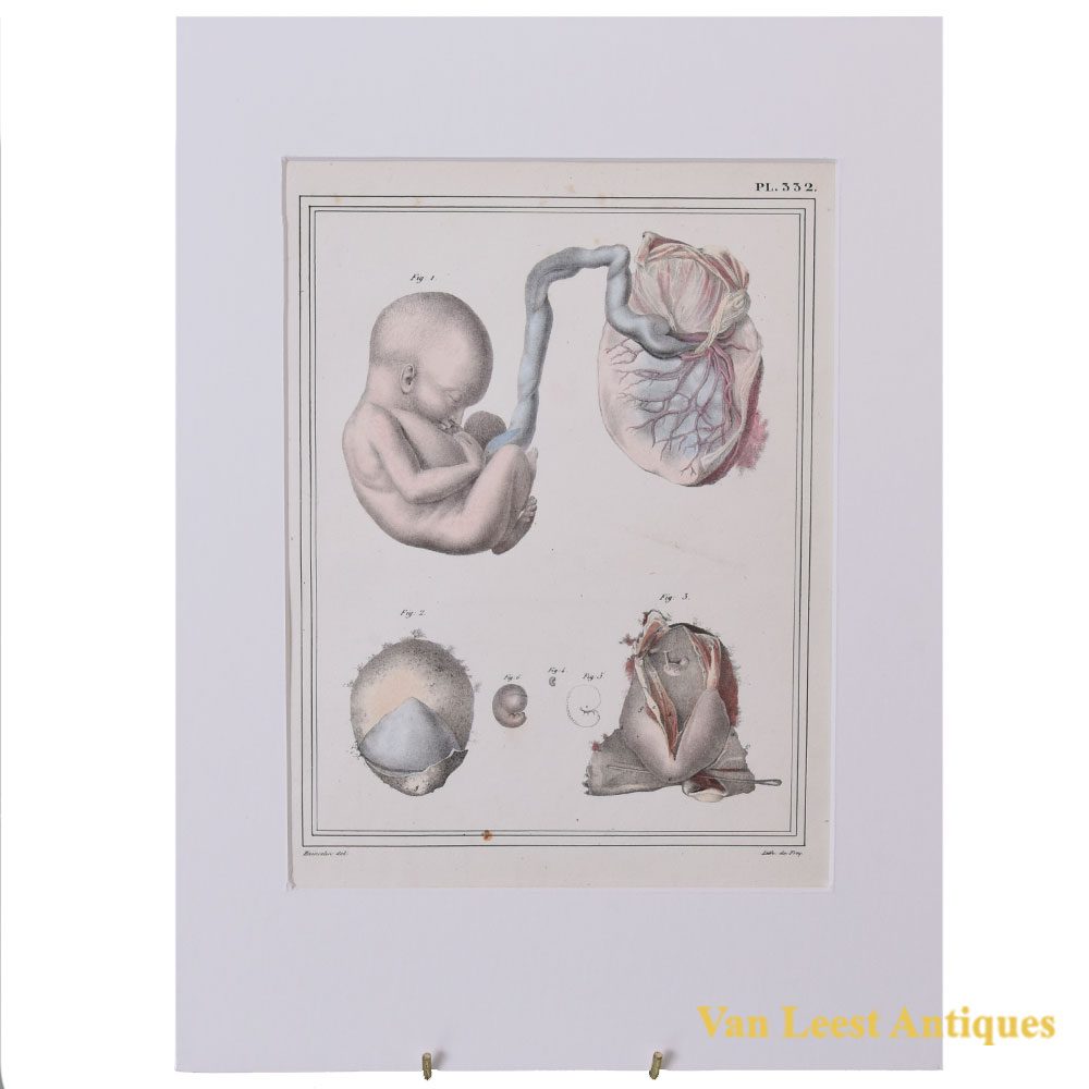Hand coloured anatomical print no. 332 of a human fetus from Jules Cloquet’s Manuel d’anatomie descriptive du corps humain of 1825 from volume 2 (of 4 volumes). The volume contained over 340 illustrations of Haincelin. Besides from the one shown here, we have many others, with various topics, don’t mind to get in touch with us.
