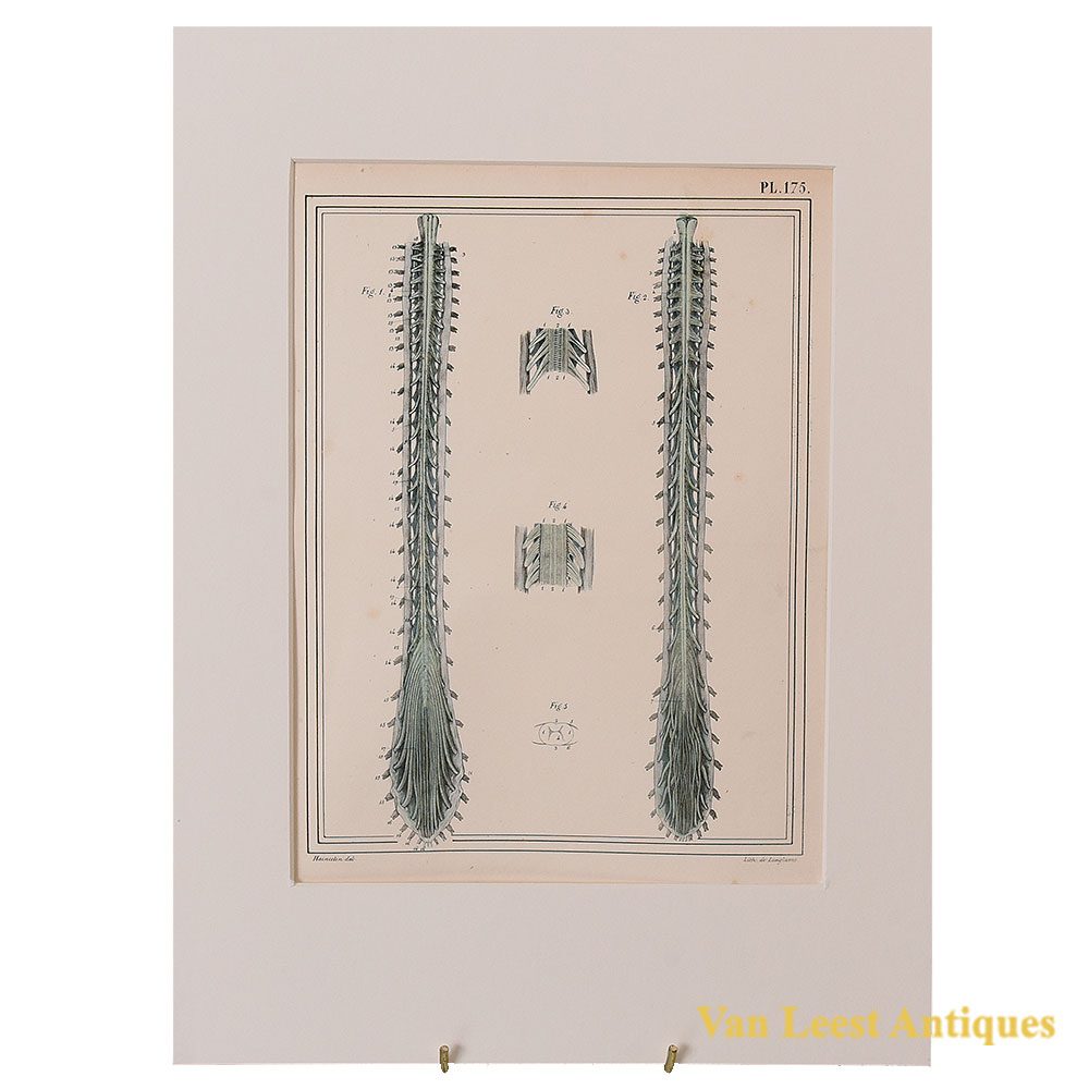 Hand coloured anatomical print no. 175 with the Spinal Nerves system of Jules Cloquet’s Manuel d’anatomie descriptive du corps humain of 1825 from volume 2 (of 4 volumes). The represents the superficial nerves of the face and neck. The parotid gland has been removed to show the division of the branches of the facial nerve which are hidden by this organ.