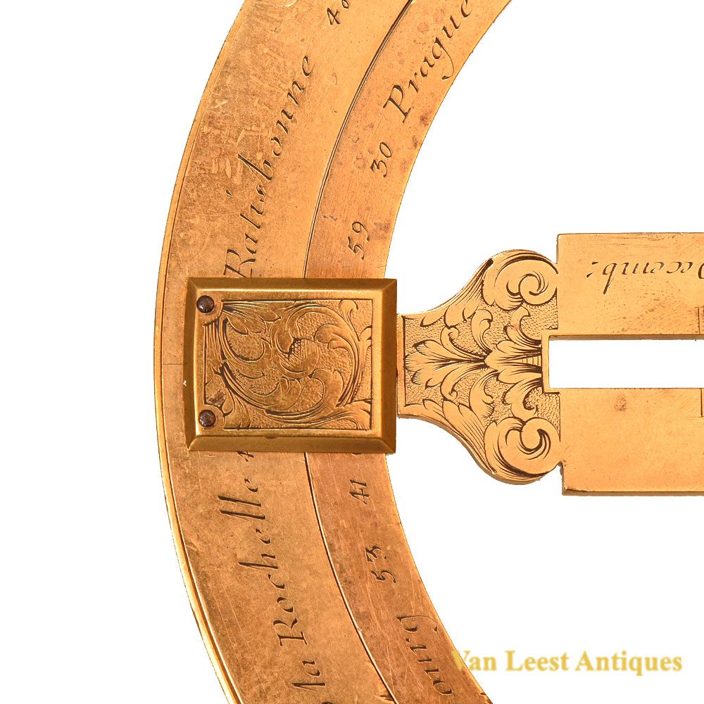 The reverse has a list of eleven mainly Russian cities (of which one behind the bridge): ‘Amsterdam 52 21’, ‘Petersbourg 60’, ‘Moskou 55’, ‘Smolensko 54 30’, ‘Varsovie 52 14’, ‘Cracovie 50 10’, ‘Dantzic 54 22’, ‘Copenhague 55 41’, ‘Hambourg 53 41’ and a city behind the bridge with 59 30. Along the pole axis, a rotating bridge with acanthus patterns allows to adjust a pinhole according to the position of seasons and zodiac. One side of the rotating bridge carries a date scale marked from solstice to solstice by months in French, subdivided to 10 days. The other side carries a zodiac scale, divided to signs marked by their symbols and divided to 10°. A sliding pinhole gnomon is set between bars of the bridge. Note that the stand is probably made later.