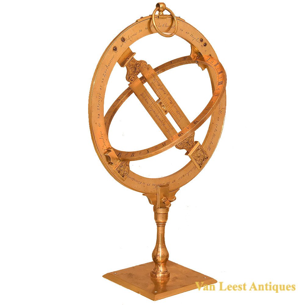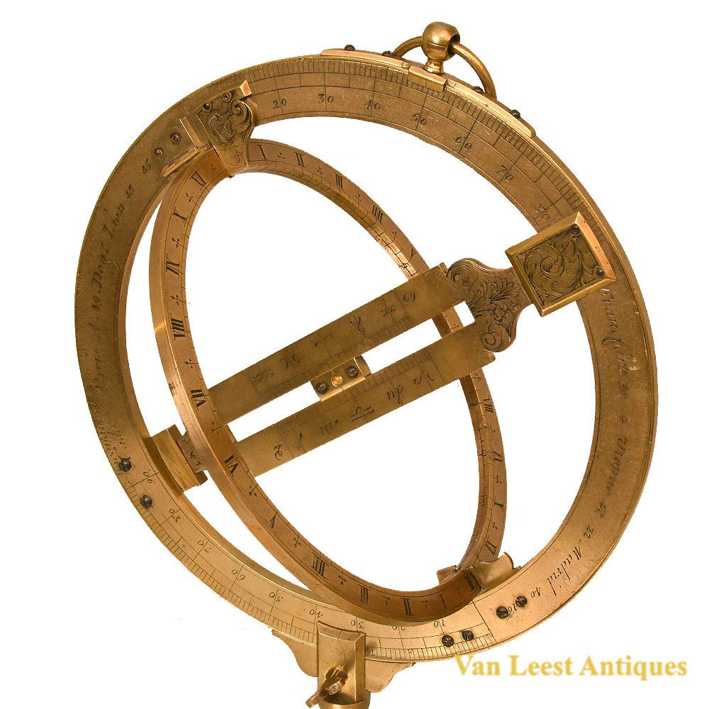 The equinoctial ring (inner) has an hour scale numbered clockwise I-XII twice and on the inner side from 1-12, divided to 30 and to 15 minutes.