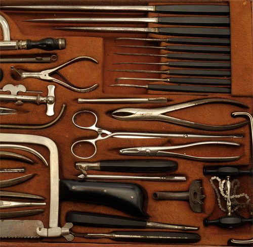 Mahogany case with red faux suede lining and decorative brass corners, fittings, and presentation plate on top. With paper label in the lid, ‘composition de la caisse complete d’instruments de churgie, modele transforme, pour les batiments de l’etat, par mathieu, fabricant d’instruments de churgie, 113 boulevard st. Germain paris’.Under the lid a removable tray fitted for instruments, underneath the tray more removable cases with fitted instruments. Most of the nearly 75 instruments signed mathieu.The contents are to divide in several in categories such as: general surgery, amputation, trepanning, catheterization,e.N.T., dental. The case exterior is in fine overall condition and so are the instruments. Meas: 33.5 x 58 x 11.5cm.