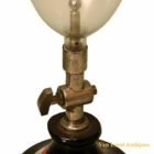 An electric egg on a metal base. C. 1910. The electric egg lies at the intersection of two technologies: high vacuum and high voltage. By the eighteen sixties vacuum pumps, and induction coils and electrostatic machines (including Wimshurst and Voss machines) had developed to the point where it was possible to create an electrical discharge in the residual gas between two small spheres in this vacuüm pulled space. The distance between the two poles can be in- or decreased by turning the knob on top of this object. Heighth 41 cm, diameter 9 cm.