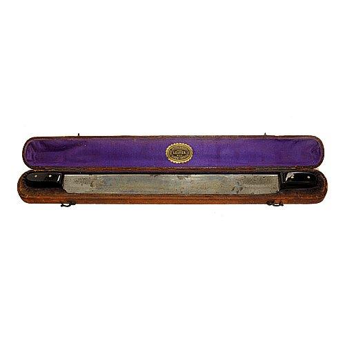 A microtome knife in original case. Both, the sheath as the knife, are signed by j. Leiter, wien. Microtome knife is used for cutting coupes for microscopic examination. Length knife 35 cm.