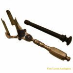 A rectal speculum with unplated handle and unplated steel tri-valve blade mechanisms, with the original ebonised obturator, Signed BIASION. By rotating the handle the three blades extend or retract. The instrument is in good condition with a small crack in the obturator. A similar instrument can be found in the 1891 catalogue of Arnold & Sons as ‘no. 112 Trivalve, Ebony plug’, last image for illustration.