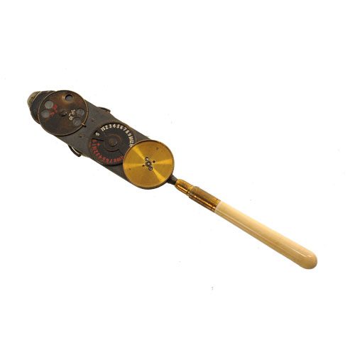 An morton opthalmoscope, after 1883, in original case by retailer krohne & sesemann, london. Instrument consist of painted brass frame, two perforated glass mirrors. 12 positive and 17 negative lenses. There is an other movable disc containing 4 lenses and one empty holder. The bone handle is in good condition. Dimension case:12 x 6,5 x 3 cm.
