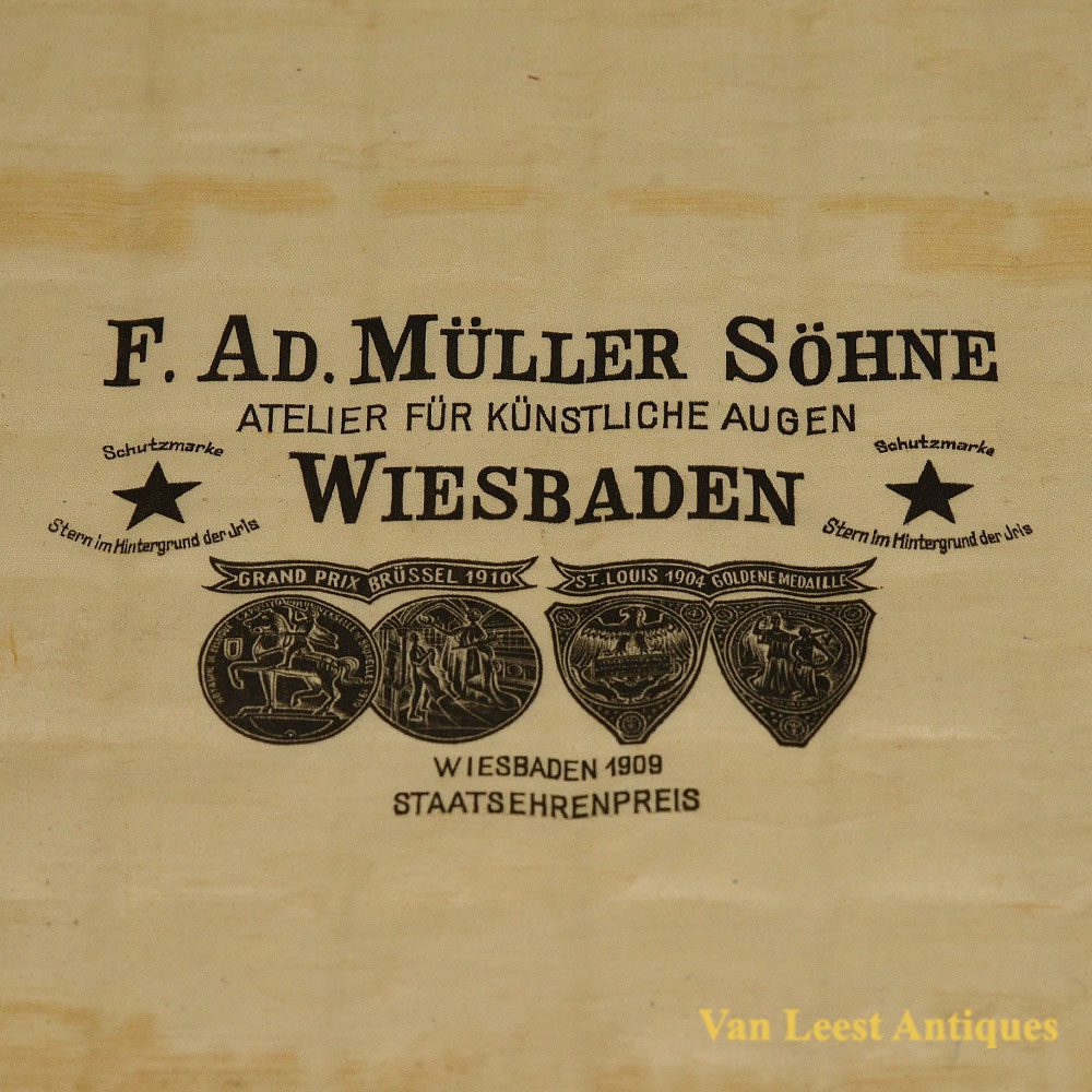 The boxes and artificial eyes are in good condition: on the outside are no severe damages. The velours on the inside is in excellent condition and the logo’s ‘F. AD. Müller Söhne Wiesbaden / Rhein Taunusstrasse 44’ are perfectly readable.