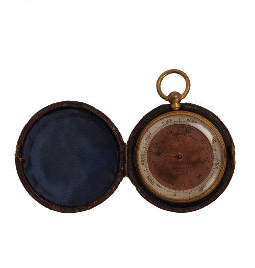 Pocket brass aneroid altitude barometer in a leather-covered case. Signed by: chadsburns ltd, 47 castle str, liverpool. The altitude scale is 0 to 8000 feet, the presure scale 23 to 31 inches. Diameter 5,4 cm