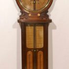A interesting and distinctive bulb cistern barometer. The paper register plates have the royal coat of arms and the prince of wales feathers.The glazed case is made of oak and everything is symmetrical exept for the tube. Fahrenheit ans centigrade thermometers are fitted below admiral fitzroy’s special remarks for rising and falling conditions. The two ivory keys, below the circular dial, control pointers each side of the tube to which are attached hands that indicate the weather conditions listed round the dial. This instrument is in a very fine condition and 105cm tall, diam. Dial 28cm.
