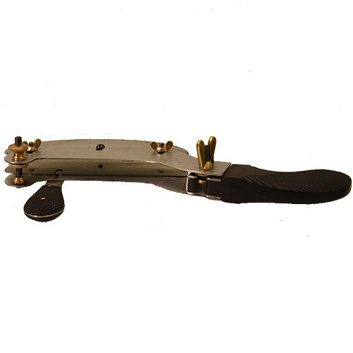 Mainly a post mortem instrument. The single rachitome was used to cut through the lamina of the spine. The double rachitome was used to cut sections through the cord. The width of the sections could be varied with the screw and nut mechanism. An instrument with solid crosshatch ebony handles and two blades which are fixed with steel screws and brass wing-nut. Signed by Charriere, C 1860. No cracks on the handles and some oxidation on the saw blades.