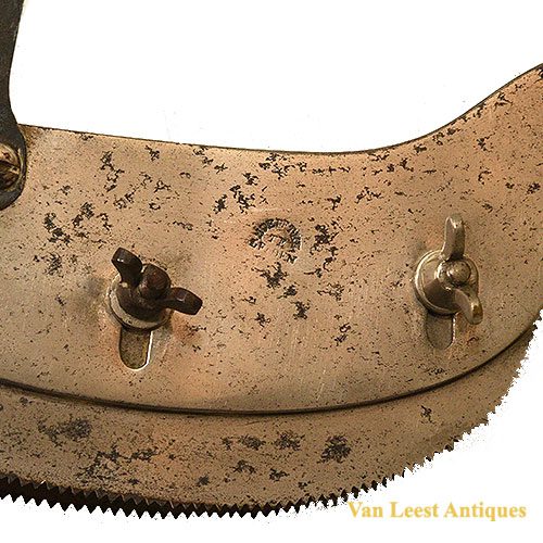 Rachitome saw by “J. Hoeff-Ticke Leyden”, mainly a post mortem instrument. The single rachitome was used to cut through the lamina of the spine. The double rachitome was used to cut sections through the cord. The width of the sections could be varied with the screw and nut mechanism.An instrument with solid crosshatch wooden handles and two blades which are fixed with steel screws and brass wing-nut. Signed by J. Hoeff-Ticke Leyden. No cracks on the handles and some oxidation on the saw blades. Length 28 cm