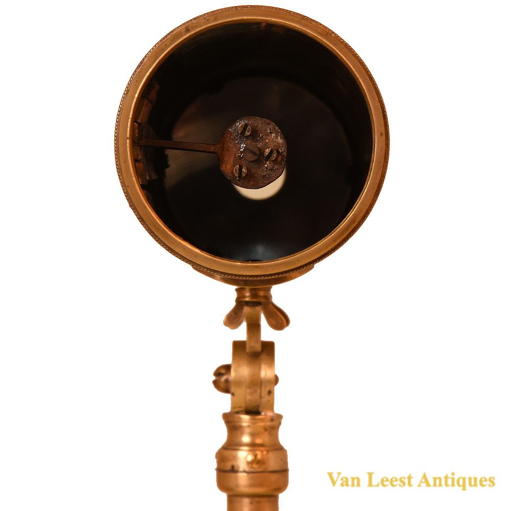 This lacquered brass reflecting telescope is signed ‘J. van der Bildt Jnr Franeker no.22’. It is made of lacquered brass and comes with its original dust cap. The objective tube (I 34, 0 7.5) contains a main mirror (7) and a secondary mirror (0 2.0). The eyepiece (I 6.5, 0 2.2) has a compound ocular and a dust coverage slide. Similar numbered telescopes of ‘Jan van der Bildt Junior’ are known ranging from no. 20 (Eisinga planetarium Franeker) to no. 63 (this telescope). One copy is known having an engraved date (‘ 1776’) instead of a number (SG Prof. Zeeman, Zierikzee). The brass folding tripod stand could be replacement because the mounting to the telescope and the decoration to the tripod is different to known examples.