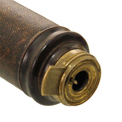 A hand hold refracting English telescope circa 1760. There are three green vellum draws, brass sliding covers to objective and eyepiece. The leather cover tube with turned horn mounts.