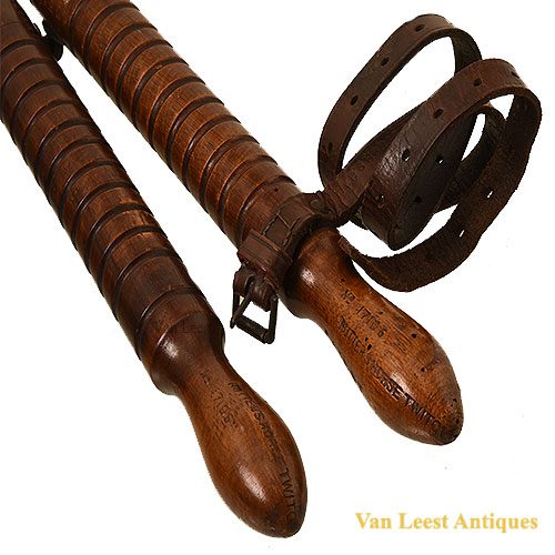 An Rutter’s Horse Twitch. This example is made of two pieces of stained beech wood, each with twelve grooves turned around their circumference The pieces are joined at the top by an iron clip. They could be held tightly together by the leather strap attached to one of the handles. Both handles zare signed with “Patent – Rutter’s Patent Twitch – No 17106”