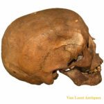 A human scafocefalie skull. It is a congenital defect that is based on a premature conclusion of that arrow seam. The skull to grow further in for- backward direction (not in width), hence his long form. It is a grave rest, from dutch soil. Probably around 1880-1900 excavated because at that time cemeteries were cleared because of urban expansion and population growth.