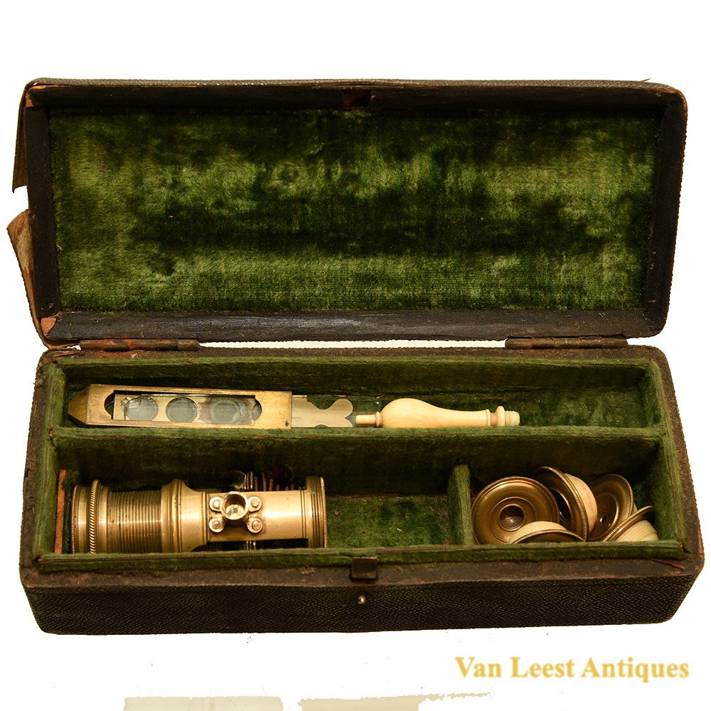 Mid-18th century unsigned Screw Barrel microscope with a splendid turned ivory handle. The microscope is constructed of lacquered brass. The stage with mounted condensing lens is hold against the large screw by a spiral brass spring. Six numbered objectives are provide with 5 ivory dome type covers. As asseccories included is a brass slider with a glass plate. The set comes in an early shagreen original wooden case lined with green velvet inside. Measurements 18 x 8 x 5 cm.
