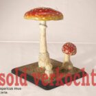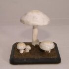 These models were made in the early 20th c. To instruct the people which mushrooms were poisonous and which were eatable. Carefully constructed after nature and very realistic concerning design and accuracy. The growth of he agaric, the two champignons and the cantharellus are visualized in three stages of development, placed upon a wooden board sized 15x15cm, they vary in height. The printed description of these fungi is glued under the base.