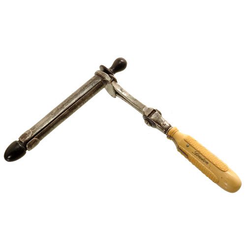 A speculum vagina by Weiss, 62 Strand, London. Very nice piece with a ivory handle and an ebony plugger. You open the Speculum by turning of the Ivory handle, inside of the handle there is a screw mechanism and move the horizontal bar down to the handle. The two outer metal bars will move outside, and they have a connection with two spreaders. The third one is moving down with screwing by the ivory handle. The ebony plugger consist of three pieces with a small damage. Further on in perfect condition. Circa 1830